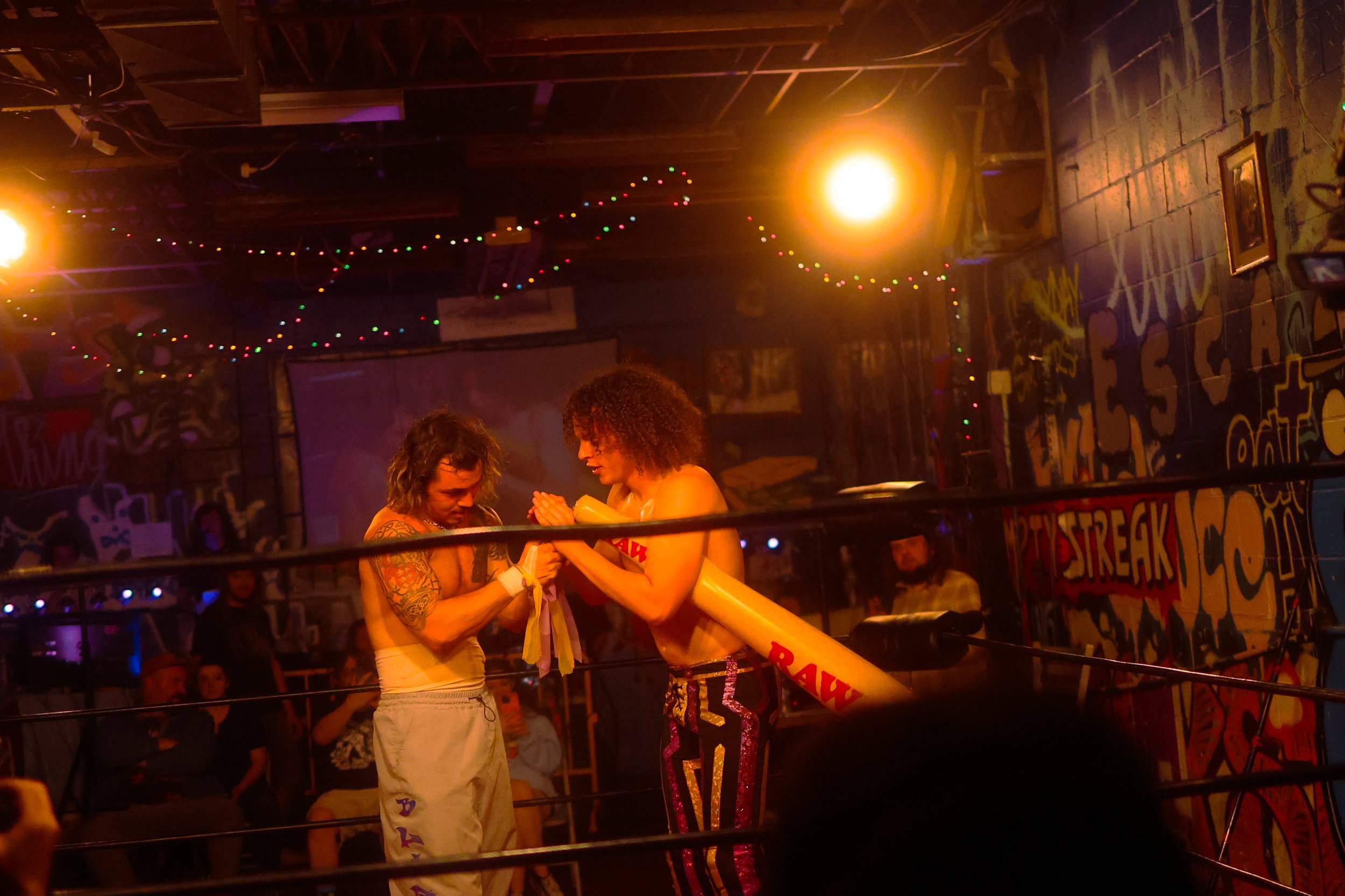 Then I found it. An open garage door. The old OneUp skate shop, its DIY DNA still embedded in the concrete and exposed beams, now reborn as a wrestling gym. The air hung thick and damp, that specific humidity that makes you check if it's raining or if you're just that close to everyone else's sweat. This is the grind. The unglamorous bottom rung where local wrestlers claw their way toward becoming somebody—even if that somebody only matters within a fifty-mile radius.